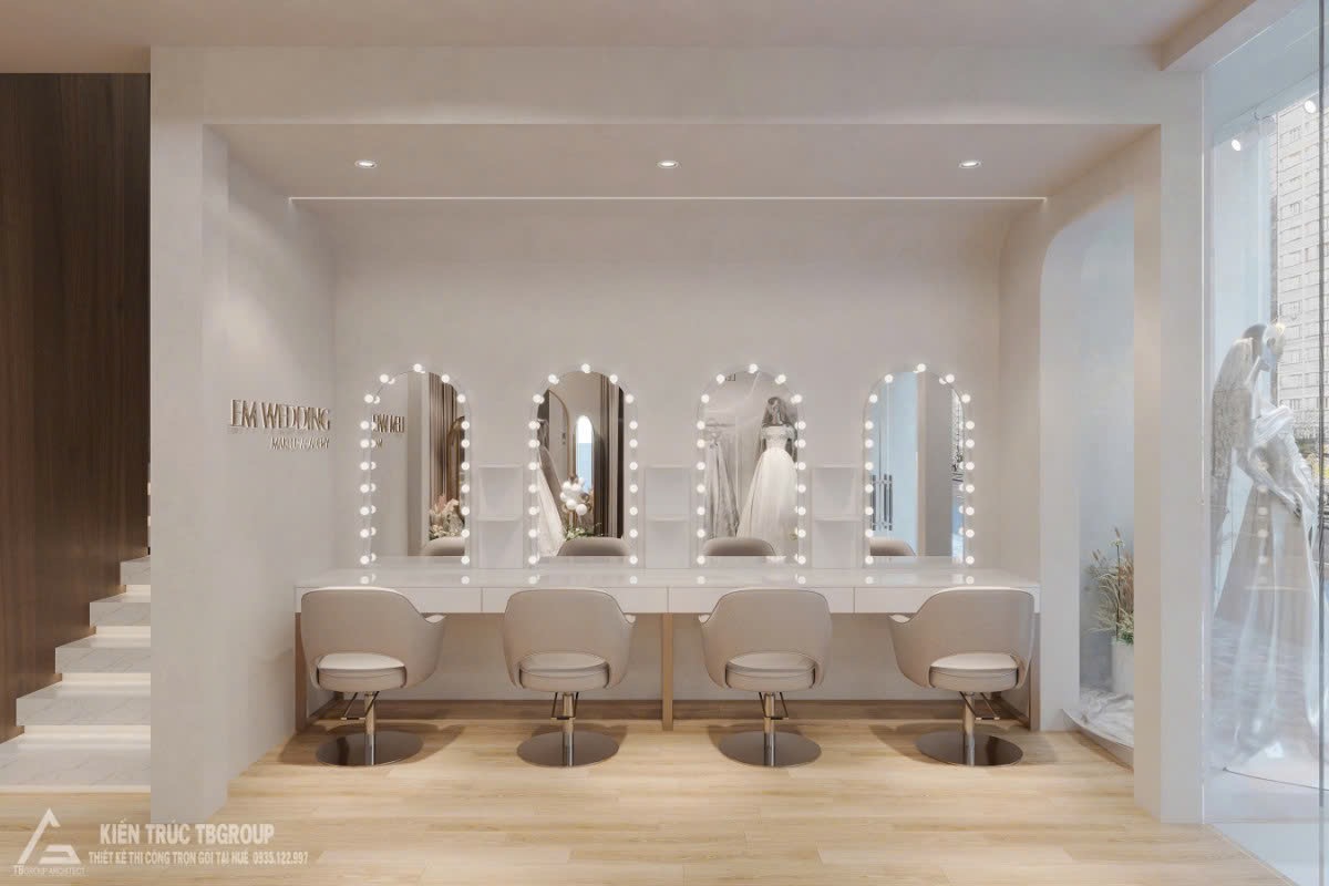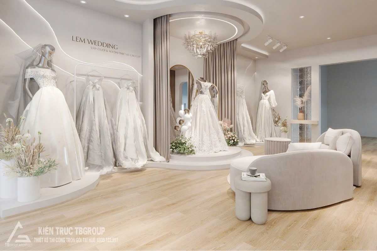 Đây là một trong những dự án tiêu biểu trong lĩnh vực thiết kế thi công showroom cưới tại Huế, nơi yếu tố thẩm mỹ và công năng được cân bằng ngay từ giai đoạn đầu.